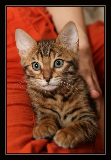 Kupídek je překrásný kocourek.U nás je to poměrně nová rasa.Poprvé se začal objevovat na výstavách v 2.pol.90 let.Už tenkrát se mi moc líbil.Ale já jsem měla černého britského EC.Bengálský kocourek je trošku vztekloučký a rád syčí.Ale to Vy velkým rozmazlováním a hraním určitě zvládnete.