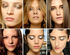 Léto přeje především zlatavým očním stínům, a ani letošní prosluněné měsíce nebudou výjimkou. Na antický třpyt zlatých očních stínů vsadili vizážisté na přehlídkách Anna Sui a Bottega Veneta. Třpytivými stíny opravdu nešetřili a pokryli jimi celá víčka půvabných modelek. Neobvyklý studený odstín ze zářivé metalické palety zvolili profesionální makeup-artisti na přehlídkách Prada a oční víčka modelek pokryli snově stříbřitým očním stínem.