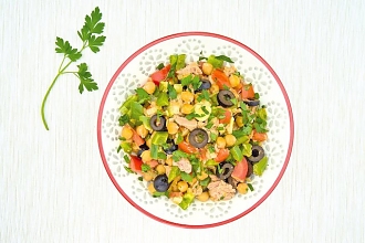 Postup: Cizrnu uvaříte podle návodu na sáčku, případně použijte konzervovanou. Na oleji osmahněte cibuli a česnek. Přidejte nakrájenou papriku a chvíli restujte. Pak přidejte nakrájené rajče a ještě chvíli restujte. Nakonec přidejte tuňáka bez šťávy a olivy nakrájené na kolečka. Vše důkladně promíchjte s cizrnou a ihned podávejte.