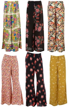 Hippie look patří toto léto mezi nejvýraznější trendy a bohémský styl by se určitě neobešel bez vzdušných širokých kalhot s vyšším pasem. A jelikož tuto sezónu jsou královnou mezi potisky květiny všech barev, tvarů a velikostí, dodaly veselý vzhled i těmto kalhotám. Na léto jsou lehké širší kalhoty maximálně pohodlné, a tak se nebojte pro jednou zradit své oblíbené skinny džíny nebo legíny a dopřejte si něco nového a neokoukaného. Květované kalhoty jsou samy o sobě již dost výrazné, doplňte je tedy jen jednoduchými nejlépe jednobarevnými topy, zajímavou bižuterií a botkami na klínku či pohodlnými žabkami.
