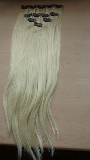 Opět mi nesedla barva a tak posílám dál. Clipy jsou nové, nenošené, velice jemné a hebké na dotek. Jedná se o kvalitní syntetické vlákno (dovoluji si říci, že vlasy vypadají jako lidské). Jedná se hustou sadu 12 ti pásků (pramenů) odstínu č. 613. Protiskluzové spony, délka 51 cm.