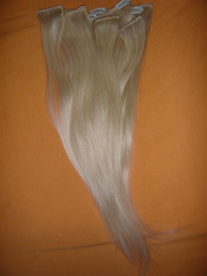 ) ,odstín 613 blond-ne do bíla ,ale do žluta viz obrázek. Nošená občas cca 6 měsíců,min. rok ještě budou sloužit. Délka 50-55 cm, vlásky nejsou syntetické,ale pravé!