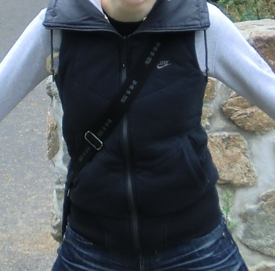 1x nošená dámská vesta Nike černé barvy, s vysokým límcem a všitou kapucí uvnitř, zapínání na zip hnědé barvy, postranní kapsy, hnědá výšivka loga Nike na předním díle.