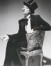 Pánský styl pro ženy ála Marlene Dietrich, bílé košile, černé kalhoty, vázanka...
