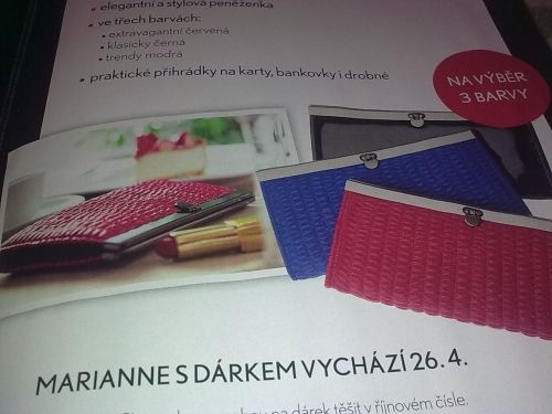 V dalším čísle Marianne, které vychází 26.4., bude peněženka. Popisují ji jako elegantní a stylovou. Budou na výběr 3 barvy- lesklá černá, matná červená a modrá. Bohužel fotku jsem nikde nenašla.