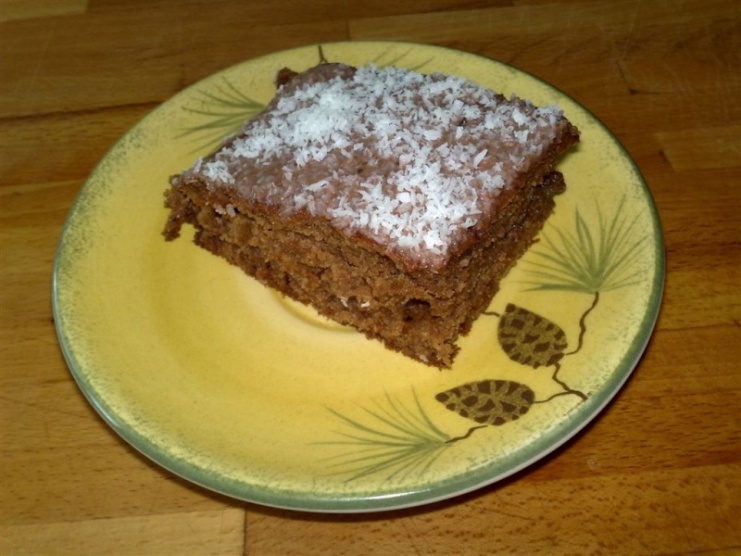 Poleva: sojové sušené mléko, kakao, trochu teplé vody na rozmíchání s rum. esencí. Po vytvoření kašičky jsem přidala 3 lžičky medu - vytvoříla se nádherná poleva. Na ni jsem dala kokos.