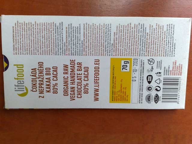 Čokoláda z nepraženého kakaa bio 80% cacao, čokoláda obsahuje pouze kakaové součásti vyrobené z nepražených kakaových bobů. Kakové boby mají významně vysoký obsah antioxidantů, jsou skvělým zdrojem hořčíku, organické síry, B vitaminů a dalších hodnotných látek, které se i ve své nepražené podobě uchovávají všechny nedotčené a nejlépe vstřebatelné. Tento produkt a veškeré jeho ingredience byly zpracovány při teplotě nižší než 45 stupňů, veškeré výživné hodnoty jsou tak zachovány. 100% bez živočišných produktů, bez mléčných a sojových přísad a bez přidaného cukru. Slazeno raw sirupem z agáve, tepelně neupravovaným rostlinným sladidlem s nízkým glykemickým indexem. Produkt je tak přijatelný pro diabetiky. Neobsahuje žádné emulgátory, pojiva, přídavné ani jiné chemické látky. Vyorbeno z přírodně bezlepkových surovin. Ruční výroba. Složení: kakaová hmota bio, kakaové máslo, bio - obsah sušiny nejméně 80%, sirup z agáve bio, mletá vanilka bio.