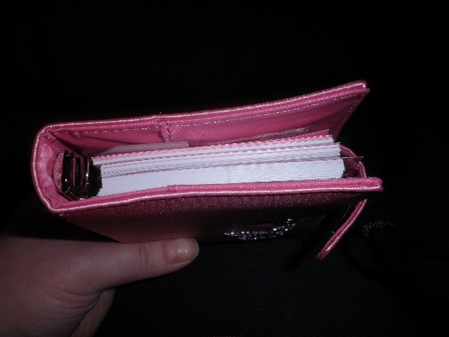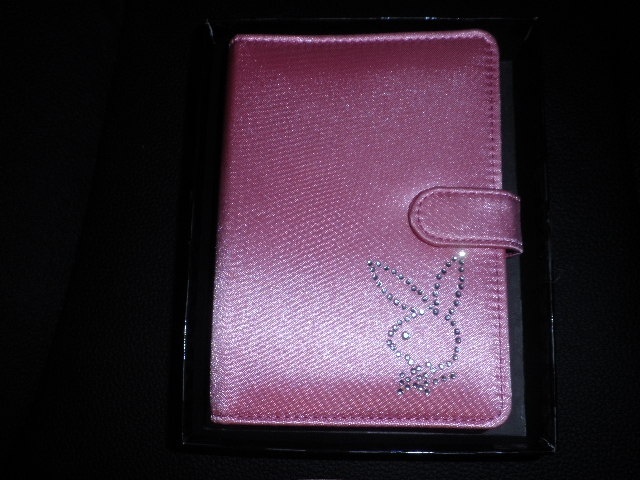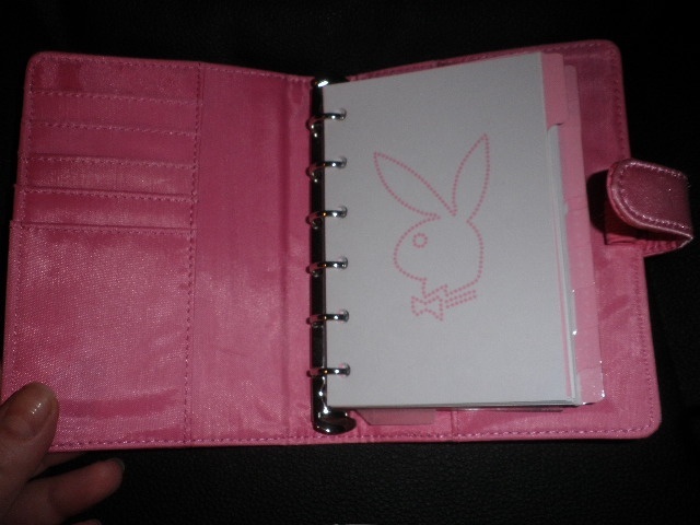 Růžový saténový diář Playboy se štrasovým logem, kroužková vazba, vyměnitelná náplň, včetně krabičky. Dostala jsem jej jako dárek od kamarádky z UK, ale na 8 stránkách s narozeninami jsou vypsaná jména (na každé straně je jedno, max. dvě) – lze buď přelepit a nebo přebělit bělítkem