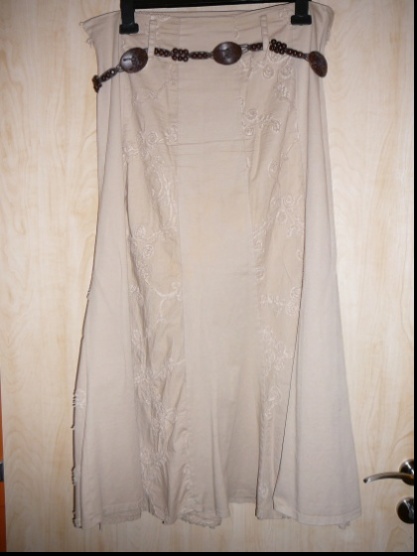 Prodám krémovou sukýnku s hnědým zdobeným pásečkem, je elastická. Zakoupenou na netu. Párkrát nošená.