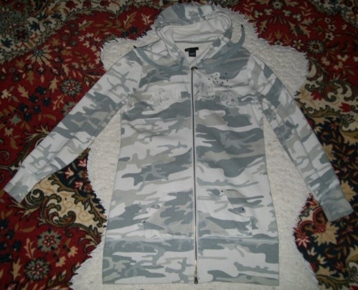Dlouhá maskáčová mikina s kapucí a nášivkami.