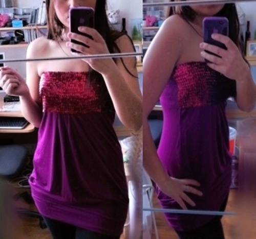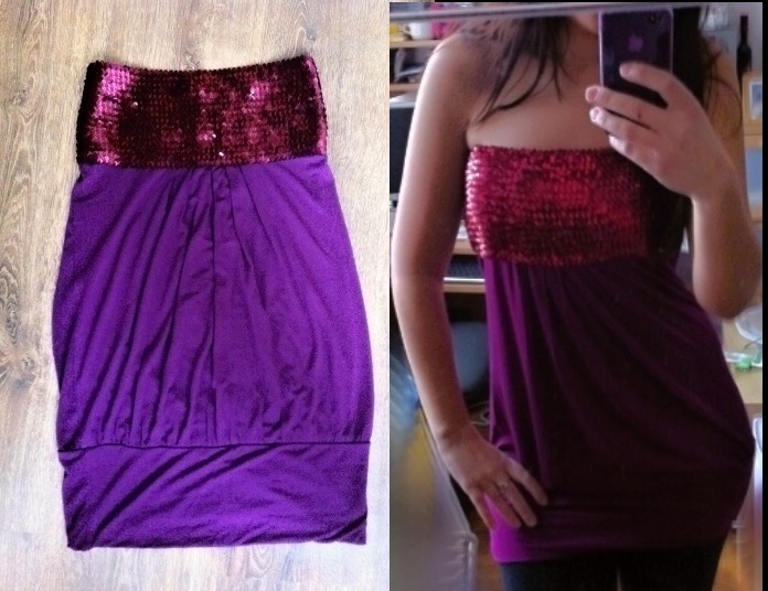 Prodám krásný vínový top / šaty, pěkný k legínkám, slimkám nebo jen tak bez ničeho..bohužel na levé straně chybí pár flitříků, ale ztatí se to v té záplavě třpytu ..