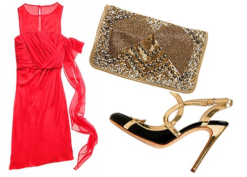 Já jsem určitě taky za zlatou. Když jsi blondýnka, myslím že ti to bude slušet. Já bych si vzala nějaké výraznější zlaté náušnice a jemnější náhrdelník. Pak bych volila zlaté botky ve stylu, jaké má slečna na obrázku a zlaté psaníčko. Jinak musím pochválit, že sis vybrala fakt krásné šatky