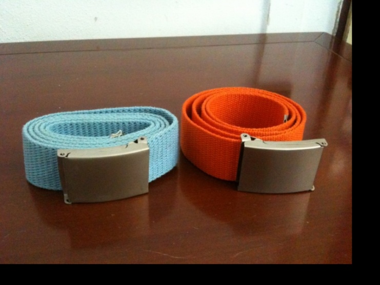 Prodávám dva pásky neznámé značky. modrý párkrát nošený a oranžový zcela nový. Cena za oba 50Kč