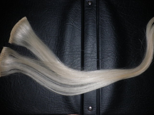 Dva nové prameny clip in, lidské vlasy, odstín č. 60, šířka 5 cm, původní délka 50 cm, ale zkrátila jsem je na 43 cm.