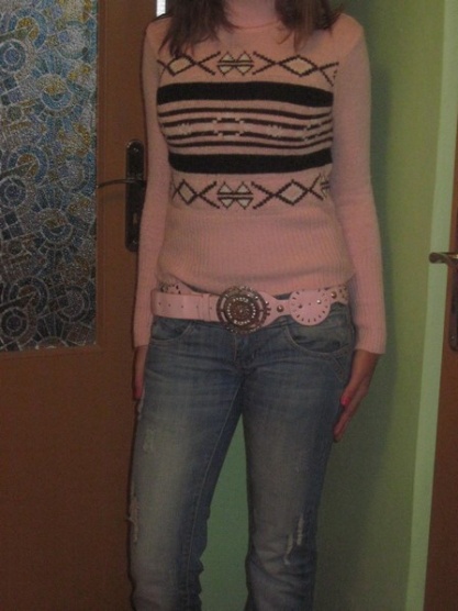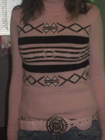 Slabší růžový svetr + růžový pásek. Použité, ale v dobrém stavu. Odpovídá velikosti S, ale dalo by se i M.