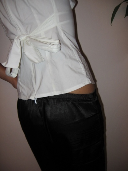 U výstřihu zapínání na knoflíčky ve tvaru a barvě perel.