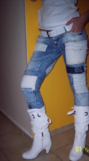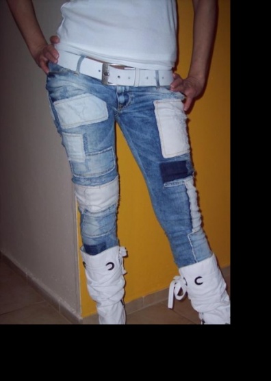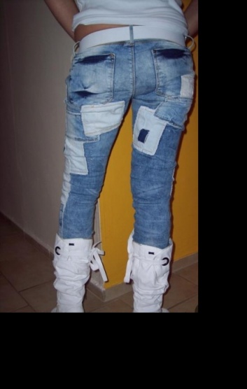 Krásné džínsy se záplatami pružné délka 100cm boky 49cm stehno 27cm lýtko 17cm p.sed 17,5cm