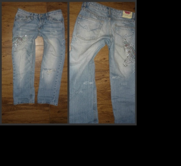 Prodám džíny nad kotníky , velký hit . Jsou jako nové špatná velikost jen 1x prané .. Na pravé nohavici s kamínku udělaný motýl na slunci se pěkně leskne . Džíny mají značku Obiettivo jeans . Místy roztrhaný styl už tak koupeno . Díry se nezvětšuji . Velikost je psaná 40 (M) ale myslím že padne tak velikosti 36 . Cena 150 kč