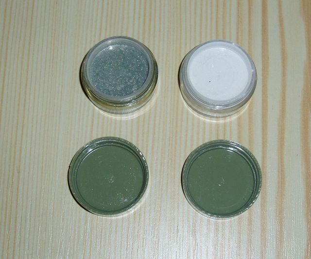 1x zelenošedá se zlatými třpytkami, odstín Mistle Toe (bohužel kelímek trošku zkresluje barvu)