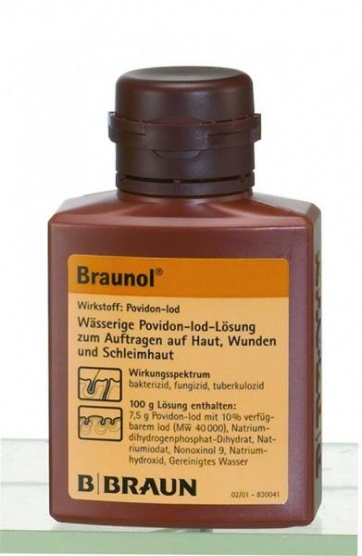 Je to taková hnědoooranžová tekutina, je tam napsaný že se to používá k desinfekci...taťka to má teda přímo z operačního sálu, ale asi to mají i v lékárně...