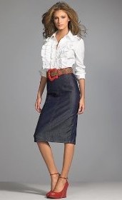 Tyhle delší riflové sukně jsou jedním slovem otřesné a vůbec ne elegantní. Mně se z vložených obrázků nelíbí ani jedna. Do práce bych zvolila klasickou "látkovou" pouzdrovku.