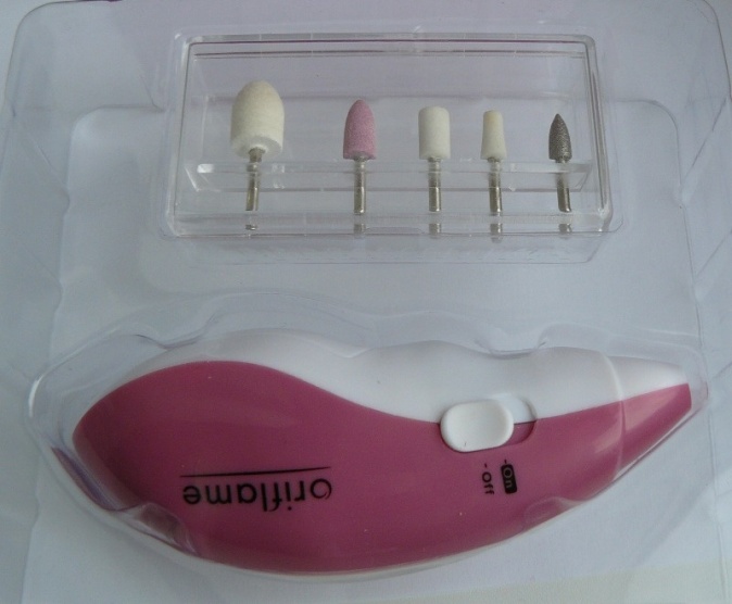 Praktický nástroj pro snadnou úpravu nehtů obsahuje 5 vyměnitelných nástavců: lešticí, brusný, dva modelující a zatlačovač kůžičky. Vyžaduje dvě AAA baterie (nejsou součástí balení).