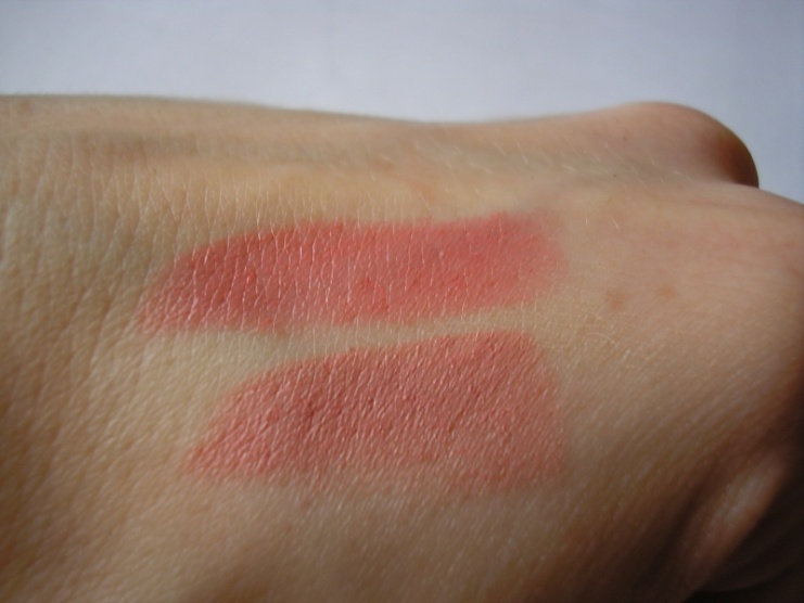 Tak první várka. Rtěnky Party Pink - ta horní růžovější a Runway Pink - ta spodní víc tělová. Runway mi vyhovuje, taková nenápadka, ale s tou Party si teda nejsem vůbec jistá. Je růžová, tedy spíš růžovozlatá, myslela jsem si, že bude taková korálová, ale teď nevím, jestli nebude na mě moc křiklavá. Zkoušela jsem ji jen na tu ruku na focení.