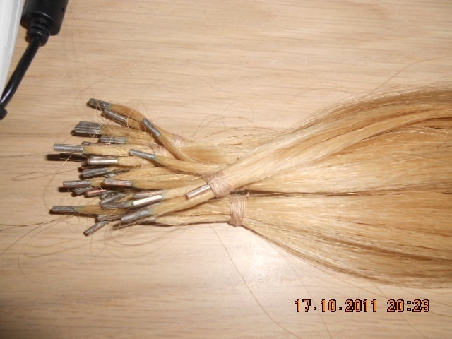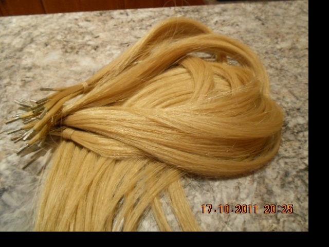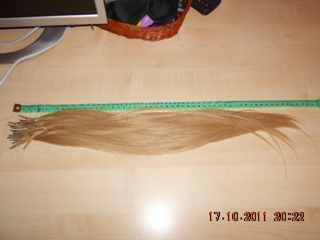 Nabízím krásné evropské blond vlásky k prodloužení, délka 50cm. Jsou kupované v salonu Yes, nachystané na metodu bond plus (spoje jsou kovové plíšky, takže vlásky krásně ve spoji drží a nevypadávaji). Pramínky jsou krásné husté. Barva je taková přírodní blond, dají se barvit a upravovat dle vašich potřeb. Pramínků nabízím k prodeji 20ks a cena je 1500,-kč