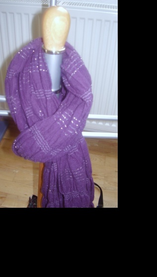 Fialová šálka, protkaná stříbrnou nití, skvěle se hodí na jaro nebo podzim.