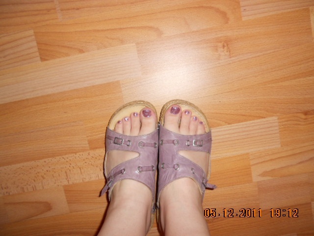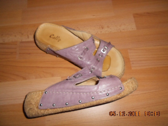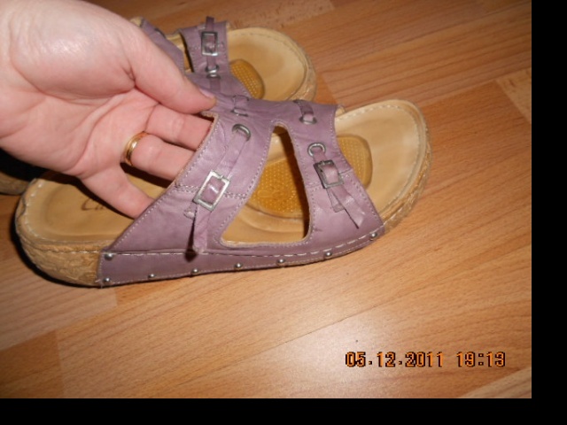 Prodám párkrát nošené letní pantofle v krásné fialové barvičce na jakoby korkové podrážce. Pantofle jsou velice pohodlné a pěkně sedí na noze. Jsou kupované v Brně v Olympii v obuvi Galex. Pořizovací cena byla přes tisíc korun. Do botek jsem pod přední část nohy nalepila gelové polštářky, pro pohodlnější chůzi, ale dají se v klidu odlepit