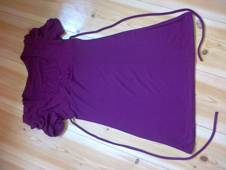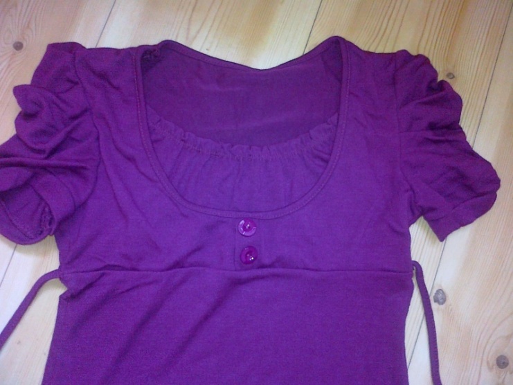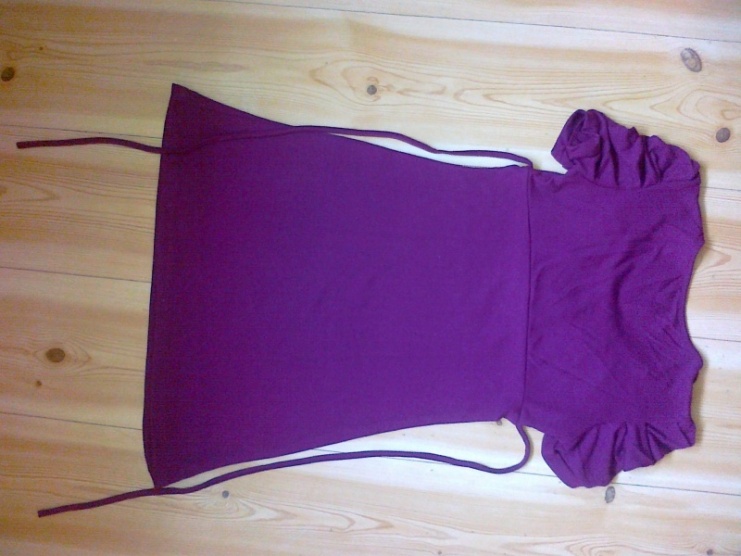 Fialové šatičky (značka neznámá) vhodné třeba k legínám - příjemný hřejivý materiál.Jsou elastické - velikost S odpovídá.