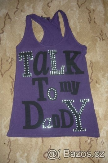 S černým nápisem pokrytým třpytivými kamínky.Top je v dobrém stavu.Prodám za 100,- Pošta zdarma