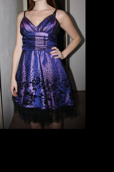 0Fialové večerní šaty s černými detaily, na ramínka, zapínání vzadu na zip. Měla jsem je na sobě jednou, jsou tedy téměř nové