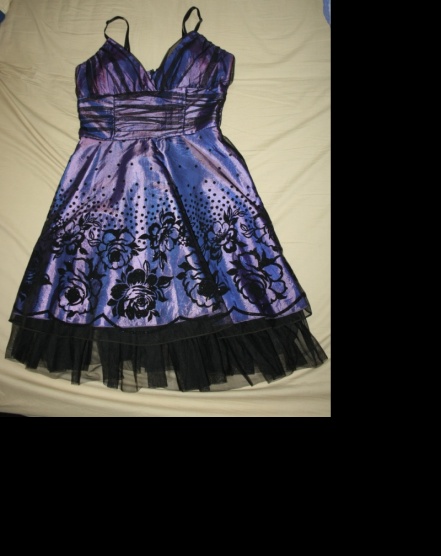 Fialové večerní šaty s černými detaily, na ramínka, zapínání vzadu na zip. Měla jsem je na sobě jednou, jsou tedy téměř nové