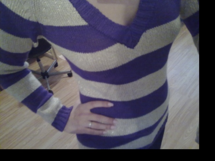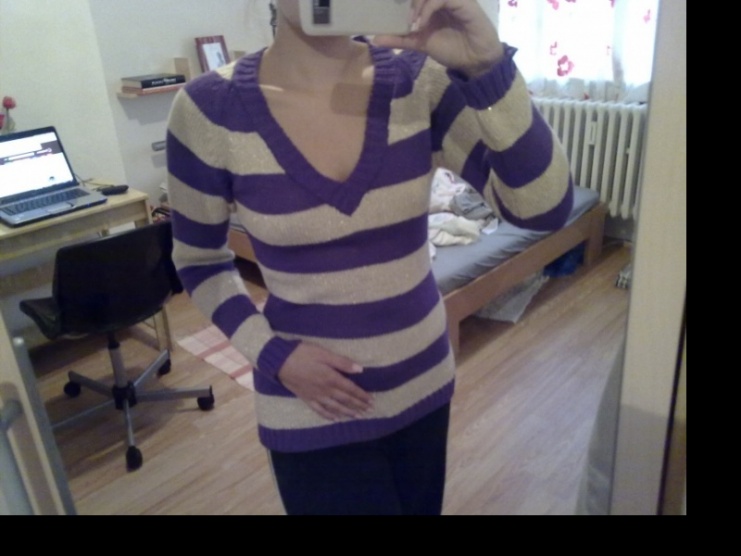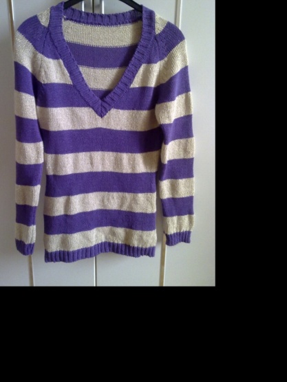 0Nabízím pruhatý svetřík - fialové a béžové barvy se zlatou nití..