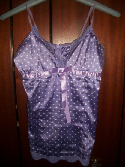 0Nabízím krásný sexy kousek, fialový top s bílými puntíčky, zn. Amsiu, nastavitelná ramínka, vzadu na zip, po obvodu krajka.
