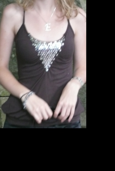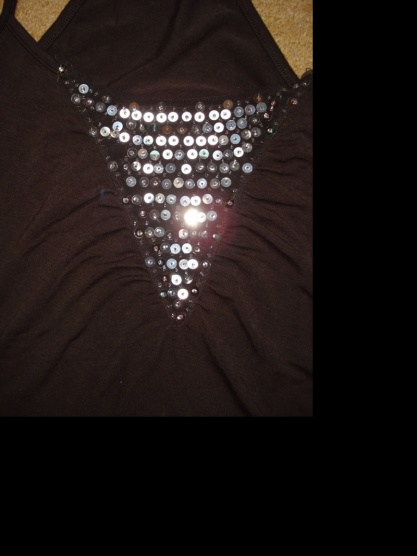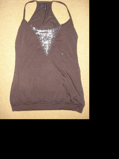 Krásný flitrovaný hnědý top, je opravdu tmavý, foceno s bleskem. Barva odpovída fotce, kde jsou jen flitry.. Pár jich je vypadaných, ale toho si nikdo nevšiml- ani nevšimne. málo nošený..oblékne i velikost M. Skryje bříško, je nabíraný