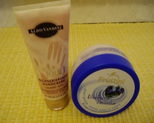 Tělové máslo,borůvkovo - jogurtové, Fruttini, 300 ml, moc příjemné, rychle se vsákne, je použité, viz. fotka Mandlový krém na ruce, s Q10, Aldo...