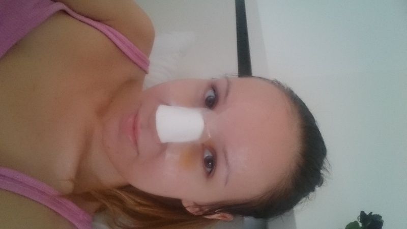 Včera se mi vybarvila do maxima jedna modřinka pod levým okem (viz foto). Jinak jsem malinko nateklá na očích, samozřejmě okolo kořene nosu a celkově rovnoměrně po celém obličeji. Juchuuu