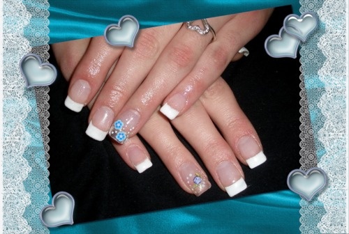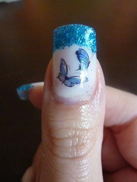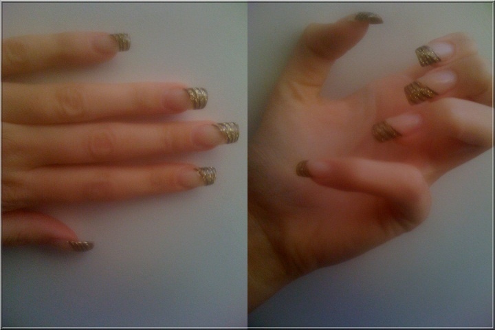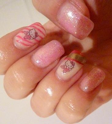 ) Na nehet na 1. obrázku jsem použila bílý gel (ne příliš sytě bílý, spíše silně mléčné barvy), na francii tmavě modré glitry a jako další zdobení jsem použila vodolepky. Na druhé fotografii jsem použila narůžovělý gel smíchány s pastelově růžovými glitry, mléčný gel, Kittynka je stejně jako u prvních nehtů vodolepka. Proužky jsou udělané fuchsiovou zdobičkou Essence a na silný pruh jsem použila zlatý lak quick and go opět od Essence
