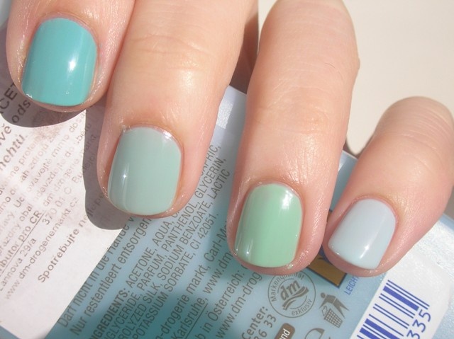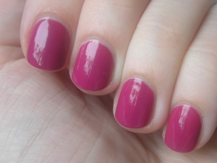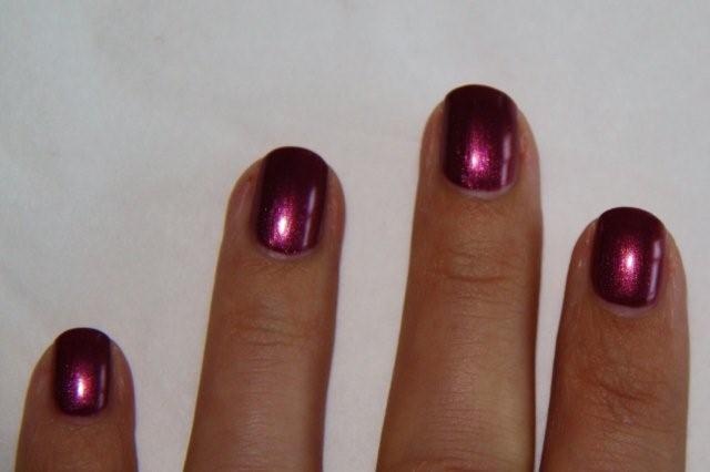 od ukazováčku dál: Essie Body Language, Essie Jazz, OPI Tickle ma Francey, Essie Looking for love (ten je lila)