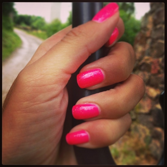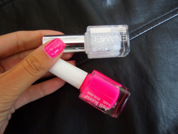 Neonově růžová od Juli Rosse a vrchní vrstva průsvitného laku se třpytky Gabriella Salvete