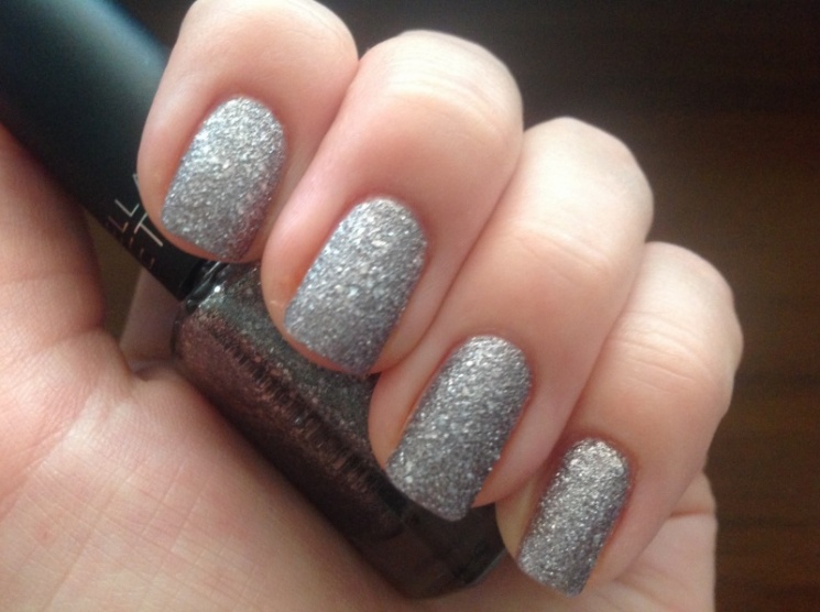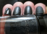 No, tady jsem si swatchla Black to the Roots z limitky Floral Grunge, který je moc fajn. Je to hodně tmavě šedá s malýma stříbrnýma třpytkama, která schne do matna. Na fotce jsem dala na malíček normální top coat (Sally Hansen Double Duty) a na ukazováčku matující top coat (Miss Sporty Check Matte). Prsteníček a prostředníček je jen jedna vrstva samotného laku.