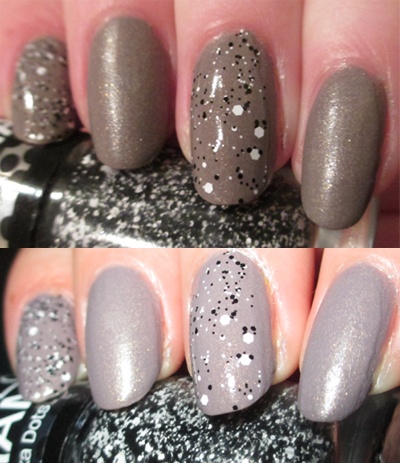 Matná světle hnědá s měděno-zlatým shimmerem Catrice Steel My Soul a přes to černobílá Colorama Polka Dots. Přirozené světlo, blesk.
