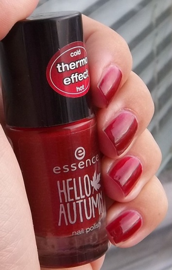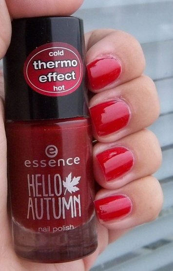 Essence Hello Autumn Thermo č. 02 Beauti-Fall Red, 2 vrstvy. Předem se omlouvám za oloupaný malíček.