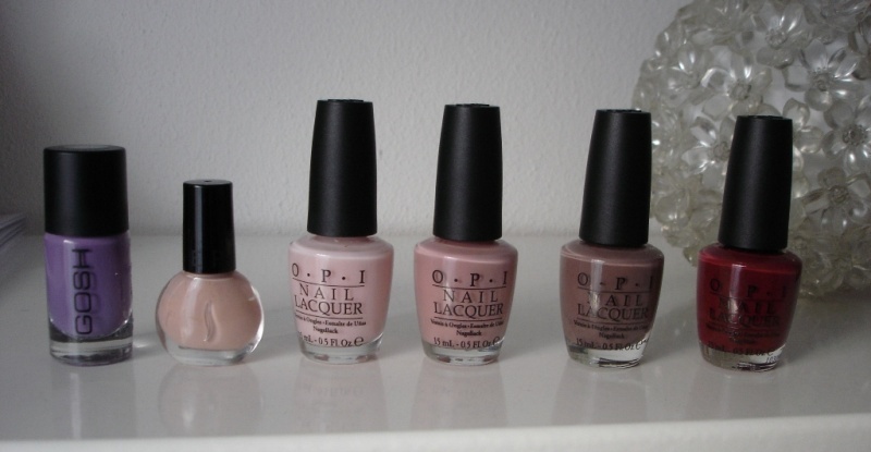 Zleva: GOSH Wild lilac, Sephora Where's my purse?, OPI Bubble bath, Dulce de leche, Over the taupe, I'm Suzi & I'm a chocoholic