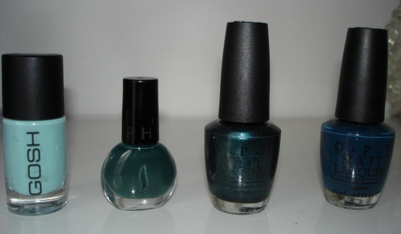 Zleva: GOSH Miss minty, Sephora Prom night, OPI Cuckoo for this colour a poslední je Ski teal we drop