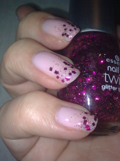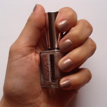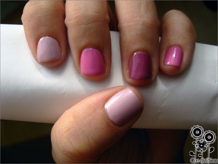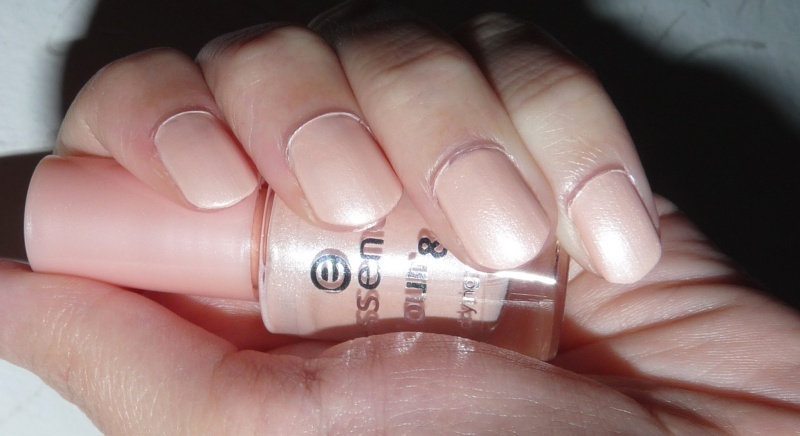 Essence 44 Modern Romance - rychloschnoucí. Jsou to 3 vrstvy, možná by chtěla i čtvrtá - nechává hodně pruhy a i při třetí vrstvě je trošičku průhlednější a pak i už hůř a vcelku hodně dlouho schne (jinak jedna vrstva je suchá ve vteřině). Ve skutečnosti víc než do růžova jde do meruňkova.