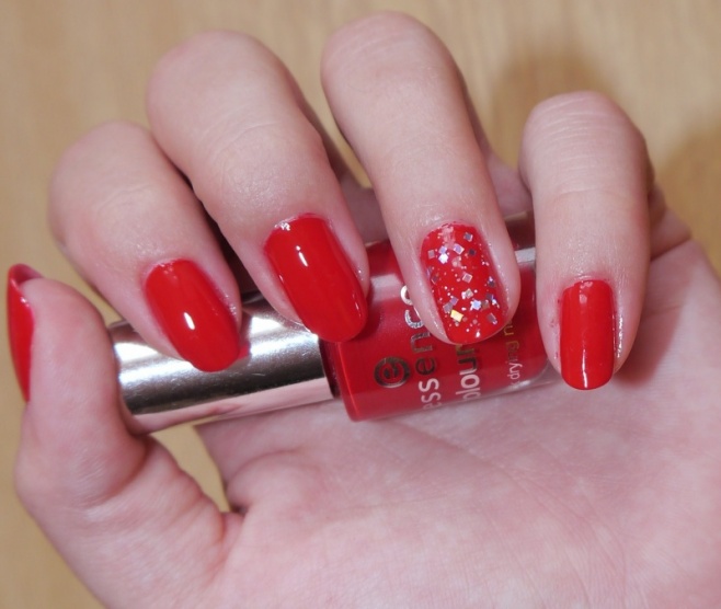 Essence 10 ready for action, plus na prsteníčku Essense nail art twins 02 julia. Použity dvě vrstvy laku plus topcoat.