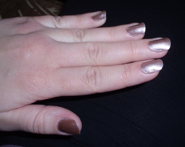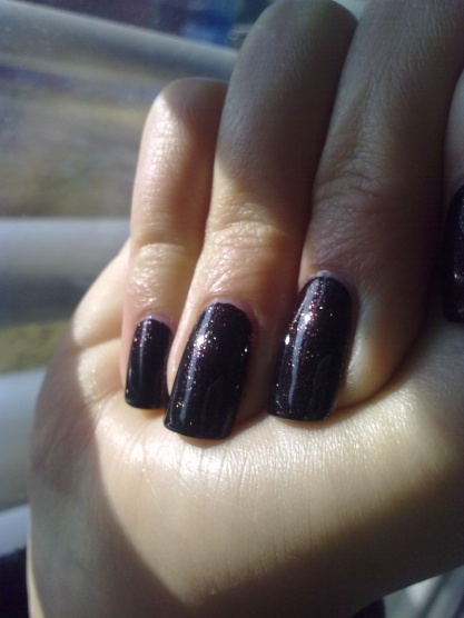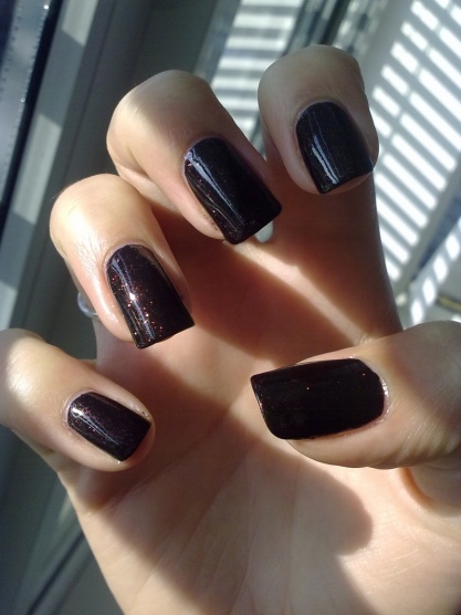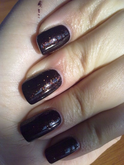 China Glaze - Midtown Magic - kouzelná černo-fialovo-hnědá s hnědo-zlatým prachem.. 2 vrstvy, navrch top coat..